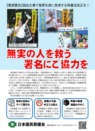 袴田事件や福井女子中学生殺人事件、日野町事件など、無実の人が誤って有罪とされる冤罪事件が後を絶ちません。こうした冤罪被害者を救済するための再審制度には多くの不備があり、被害者や家族に長年の苦しみを強いる原因となっています。「冤罪被害者を救おう」と、国会では超党派の議員連盟が立ち上がり、昨年(2025年)、再審法(刑事訴訟法の一部)の改正案が国会に提出されました。ところが、法改正に消極的だった法務省と検察庁は、これを阻むかのように、突如として法制審議会(再審関係部 会)を設置し、短期間の審議で法務大臣への「答申」をまとめました。しかし、この答申は冤罪救済どころか、再審請求をいっそう困難にし、救済の道を狭める内容です。私たちは、この答申にもとづく法改正に強く反対します。解散 総選挙で廃案となった超党派議連改正案の趣旨をふまえた、国会主導で冤罪被害者を救う法改正を実現することを求めています。皆さまの署名へのご協力をお願いいたします。